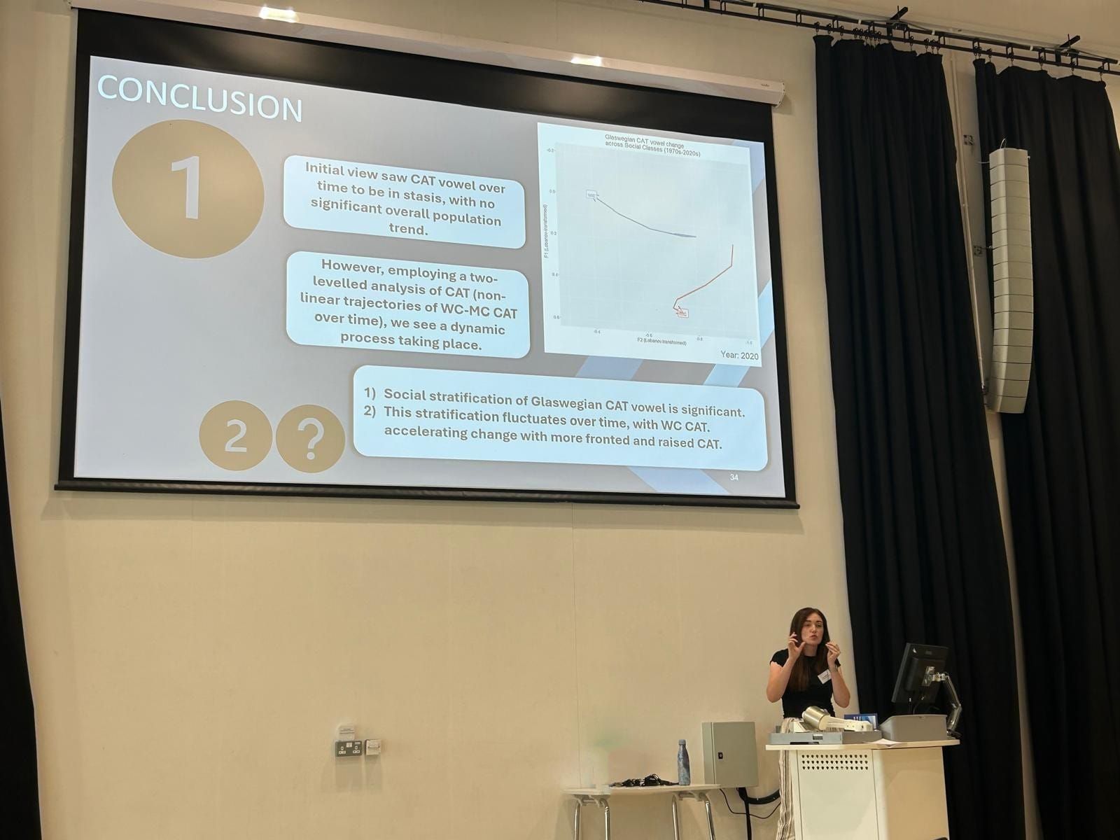 - 2nd September 2025: I presented my research at the biennial conference, UKLVC that looks at language variation and change. Here, I presented my study ‘The CAT’s out the bag’ - which looked at CAT vowel quality sound change over the last 60 years, and demonstrated the use of Generalised Additive Mixed Models (GAMMs) in plotting non-linear relationships. You can find more info on this in my research tab or better yet, get in touch!